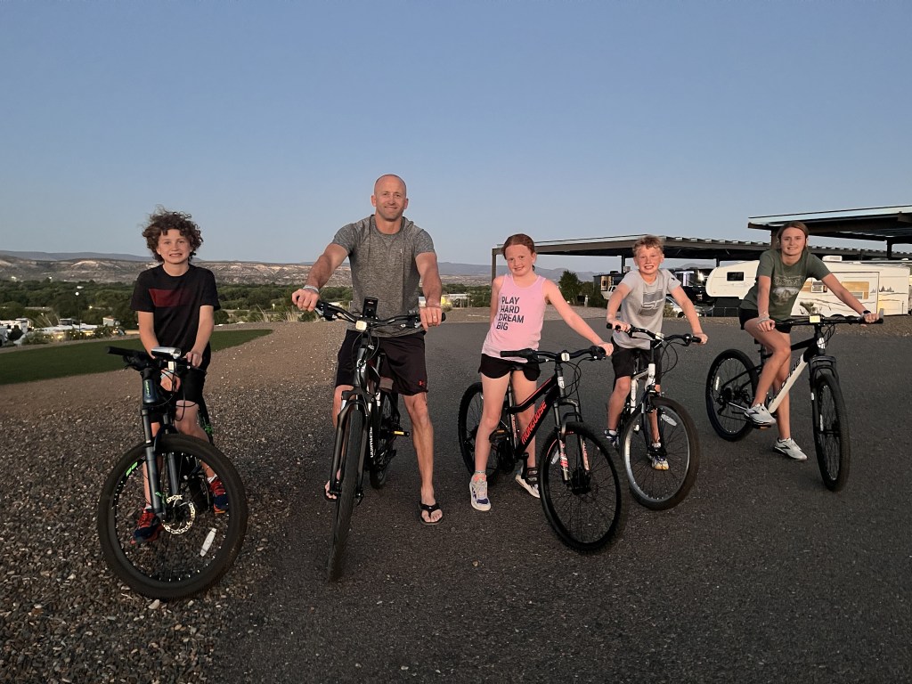 We brought all six bikes this time around. The last time we traveled out west, we rented bikes for an afternoon near the south rim of the Grand Canyon. It cost us nearly $600 for three hours. Yikes! We made sure that bikes were at the top of the list for this trip when packing. We were able to take our first evening bike ride watching the sunset. It was breathtaking! However, we couldn’t find the helmets packed underneath the bus.