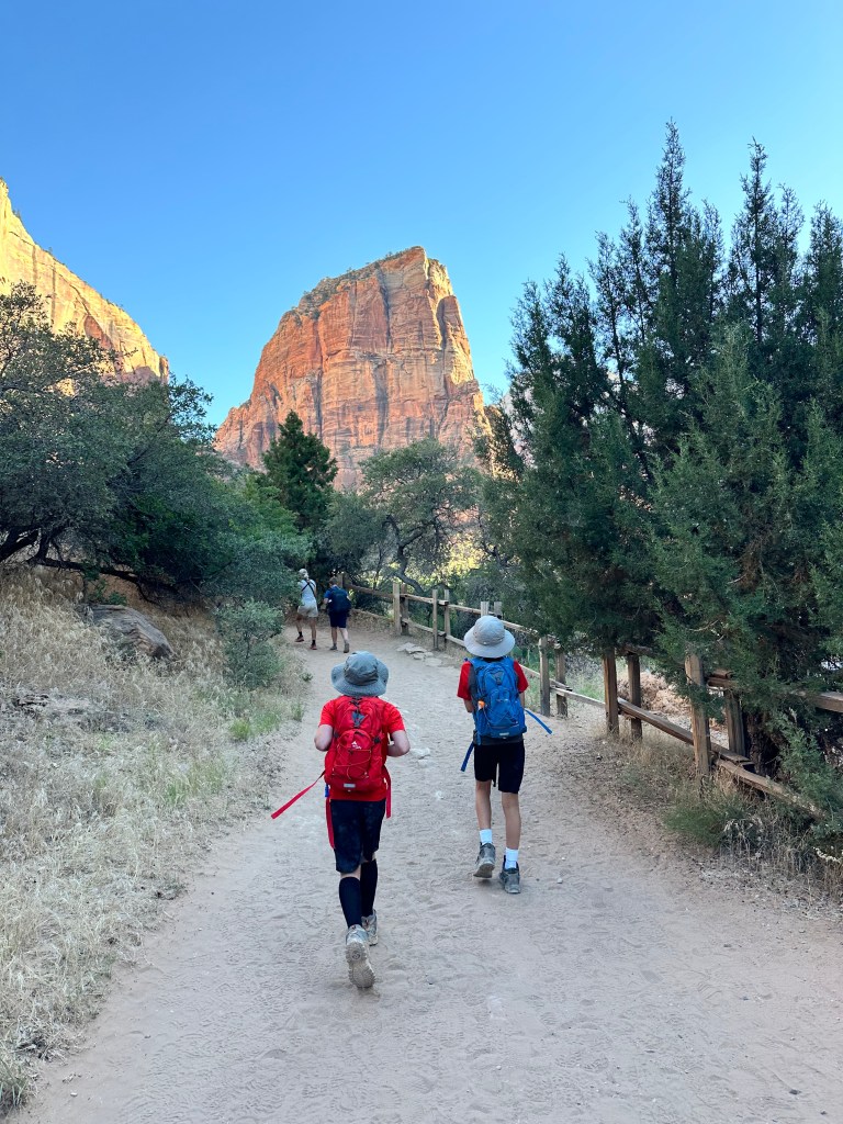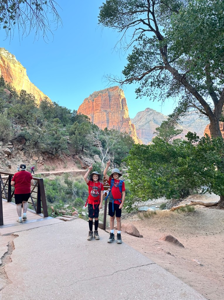 I then applied for the day before permits and was able to score a few more so Eric could take both boys. My momma heart was so nervous and I could barely sleep the night before. The boys packed water/snacks in their hiking bags and set out for the hike early in the morning. To my surprise, our boys were not nervous at all. They must have Eric’s hiking genes. 🙂 The picture below is at the parking lot.