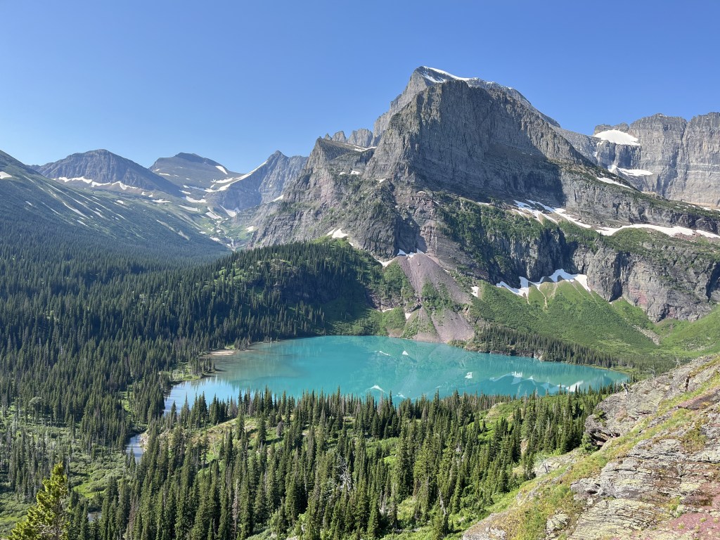 We hiked for a couple miles to view the Grinnell Lake overlook. We were bummed that part of the trail was closed due to extremely dangerous snow conditions. We were still able to see beautiful views and were able to witness a momma grizzly and two baby bears cross the path that we were on. We were a safe distance away and it was so magical watching the three together. Each time the momma grizzly moved, the babies would follow closely behind. The way they played with each other was unlike anything we’ve ever witnessed. They would knock each other over, hang from branches and pounce on each other. It was so cute!