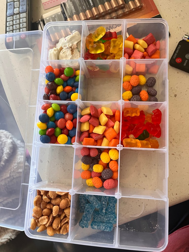 This tackle box has been a life saver. We received this as a gift from a dear friend from our school. What a great idea! Every hour, the kids pick a few pieces of candy. All of our favorites are in the box.