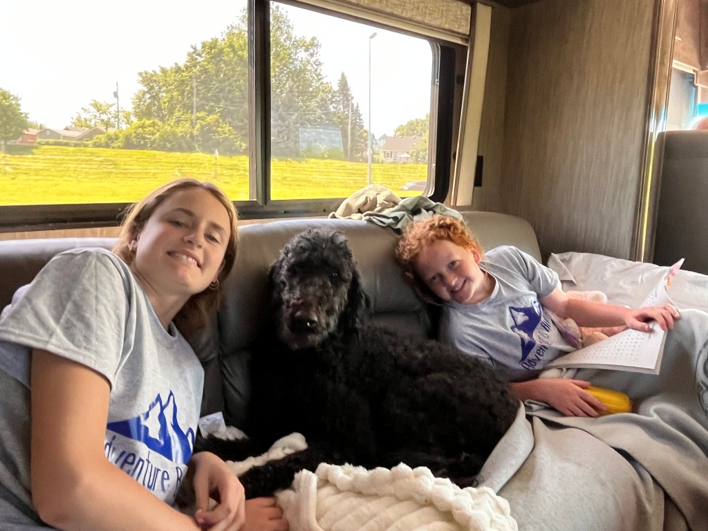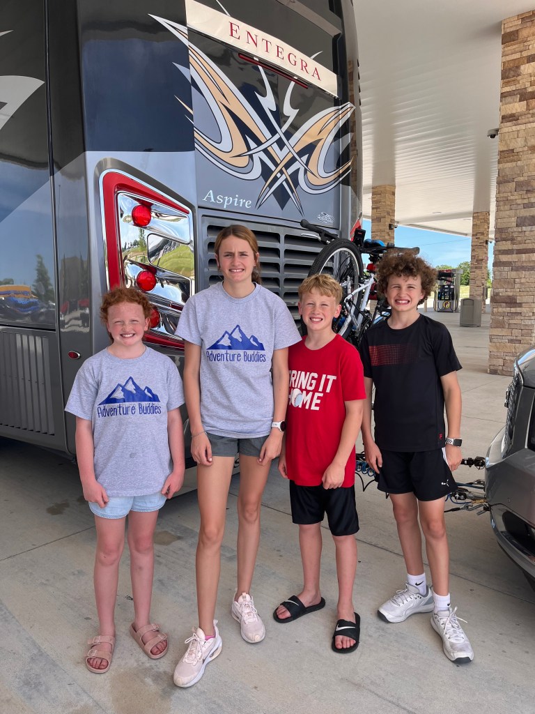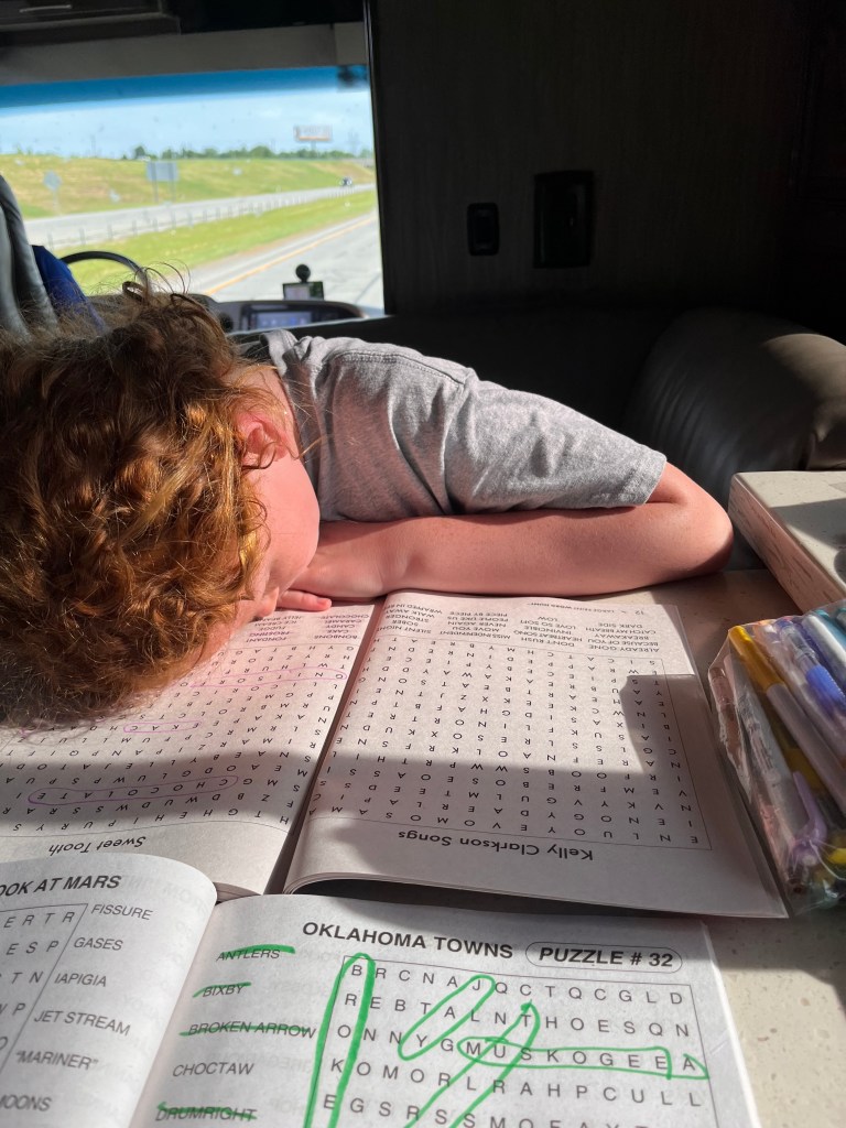 I’ve had so many ask what in the world we do to stay busy. I’ve planned many activities for the kids that I will share over our trip. I get out a few activities during each long drive. For this long 9 hour drive, we played with crafts, word puzzles, word finds, read our favorite Bible verses, and watched movies. We stopped to have leftovers. Larosa’s for the win! We love to look out the window and the kids really enjoy taking pictures. There is so much to take in with all the scenery. Lucy is also adjusting to all the sounds in the RV and the loud music. We love to jam to christian and country music to help the time pass. There is nothing more special to me than having this quality time together with our family. Thank you, Jesus!
